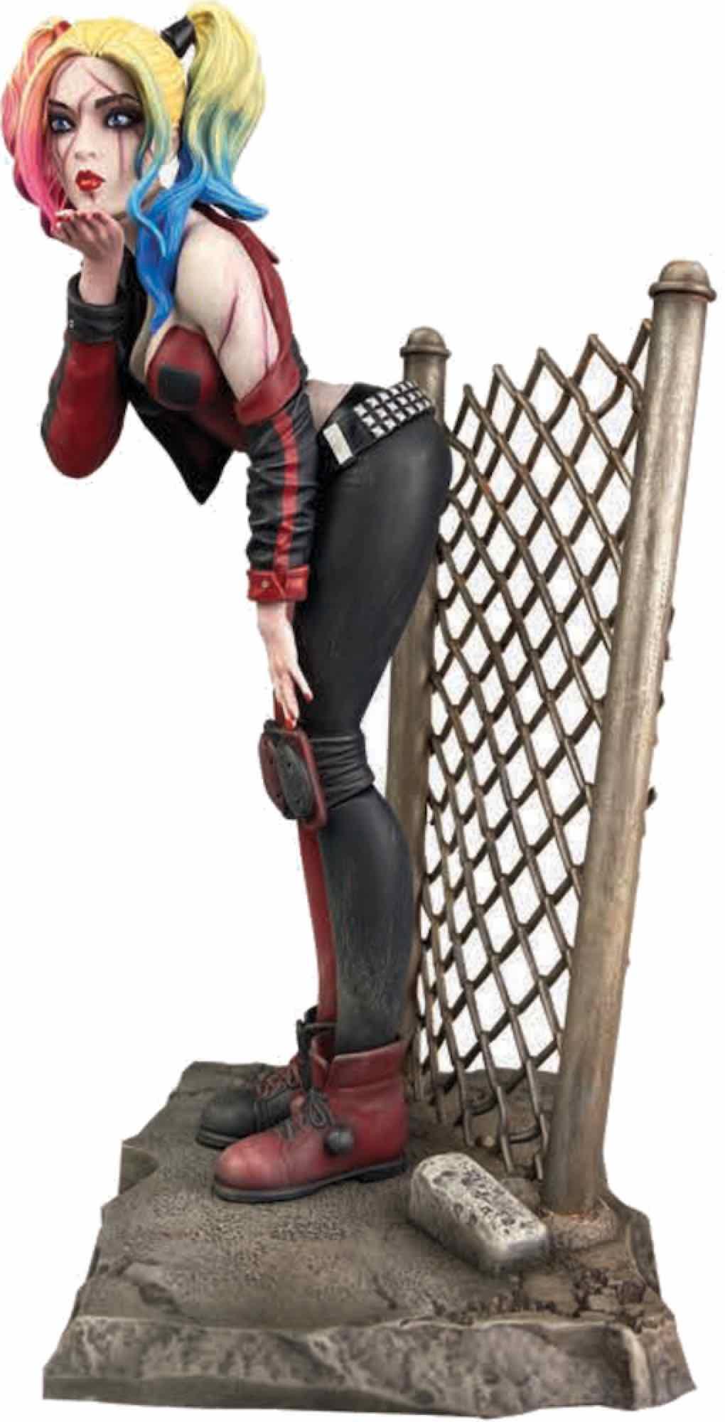 Diamond Select Toys presenta dentro de su colección DC Comic Gallery esta estatua de Harley Quinn Dceased inspirada en el evento crossover DCeased. Esta estatua mide unos 20 cm de alto, hecha en PVC y que está esculpida por Sam Greenwell. Muestra a la heroína más animada del Escuadrón Suicida, que ha sobrevivido al brote zpmbie y ha conservado su actitud característica, soplando un beso con la cara cubierta de cicatrices junto a una valla de alambre. Incluye un pequeño diorama como base para exponerla.
