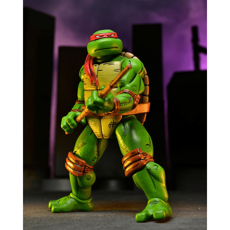 Neca presenta, dentro de la colección Scale Action, la figura de Donatello. Mide 18 cm y está basada en la historia de "Regreso a Nueva York" de los cómics "Teenage Mutant Ninja Turtles" de Mirage Studios. Incluye 1x par de manos, 1x bastón, 1x Mouser, 1x Utrom, 1x lanza, 1x par de herramientas y 1x lazo extra para la banda de la cabeza. Se presenta en una caja con ventana con ilustraciones de Kevin Eastman. Puedes exponerla junto al resto de sus hermanos (se venden por separado).