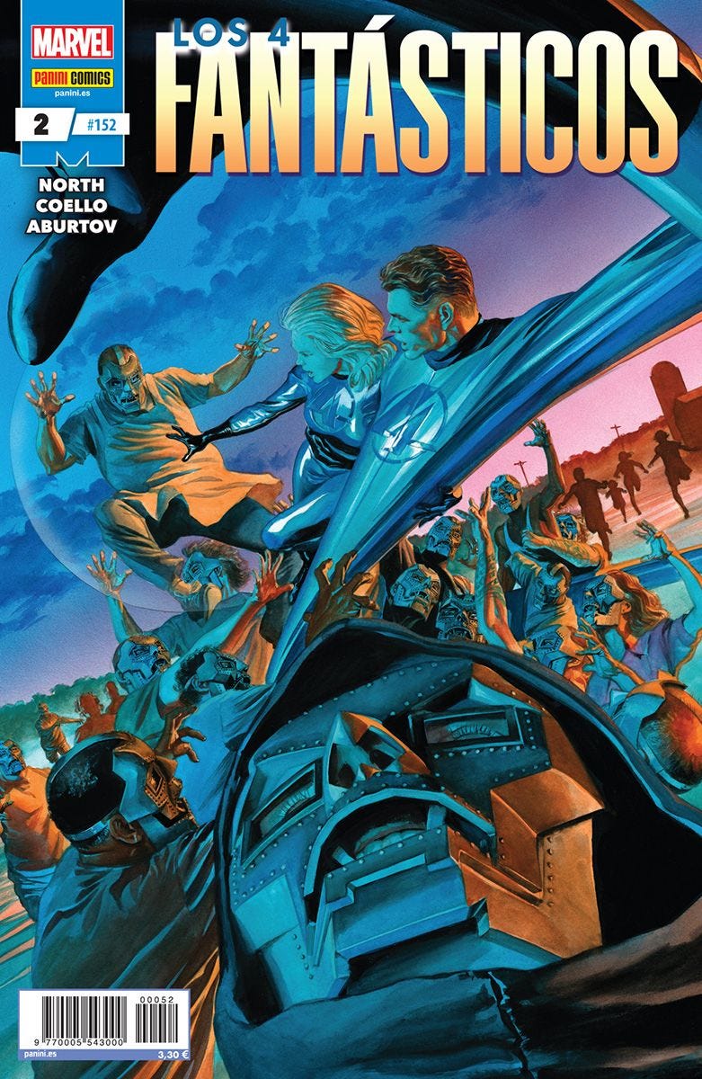 ¿Qué fue de Los 4 Fantásticos? Reed y Sue están huyendo de... ¡un montón de cosas! Pero, cuando detengan su escapada, encontrarán todavía más problemas, en una pequeña ciudad con un terrible secreto: lo descubrirás en la segunda página de este cómic. Reed y Sue pasarán el resto del cómic tratando de sobrevivir. Párate aquí, si no quieres que te hagamos un spoiler. Vale, tú lo has querido: es una ciudad llena de Muertebots.