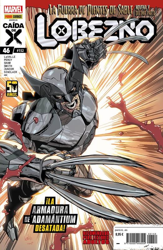 "Los dos últimos capítulos de ""La Guerra de Dientes de Sable"" Lobezno está sin poderes, pero no indefenso. Forja tiene un último invento. Te presentamos la armadura de Adamántium. Además, en celebración de las cincuenta entregas USA del actual volumen, y el medio siglo de existencia de Lobezno, recibimos al legendario guionista Larry Hama, así como algunas sorpresas especiales."