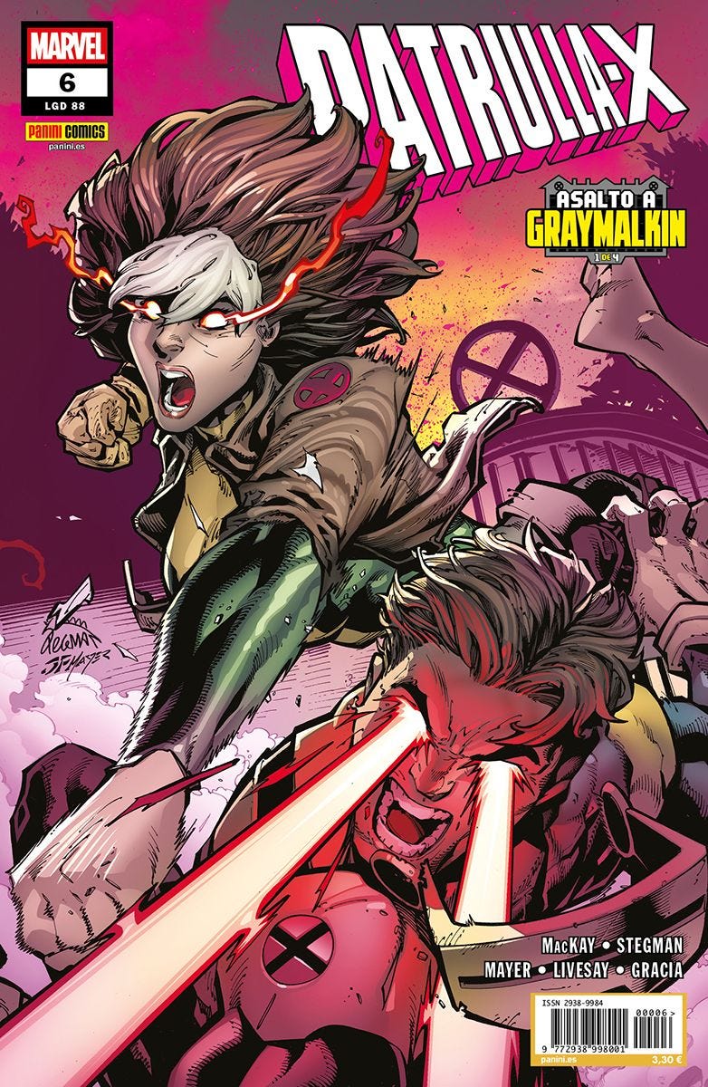 "Con la primera parte de ""Asalto a Graymalkin"". En Alaska, La Patrulla-X emprende una misión de rescate para liberar a su compañero encerrado en Graymalkin, mientras que, en Luisiana, La Imposible Patrulla-X preparan su propia incursión. ¿Entrarán ambos equipos en conflicto? Después de todo, una X se forma con dos líneas que se cruzan."