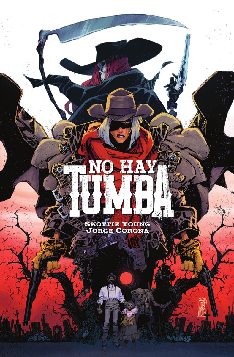 UN WESTERN CON ELEMENTOS FANTÁSTICOS ÚNICO Y EMOCIONANTE El guionista ganador del premio Eisner Skottie Young y el dibujante nominado al premio Eisner Jorge Corona, ambos responsables de las exitosas series Middlewest y Soy quien amas en la sombra, vuelven a unir sus talentos en esta nueva historia de género repleta de amor, pérdida, balas y muerte. No hay tumba nos relata la aventura de Ryder, una forajida que intenta dejar atrás su violento pasado tras enamorarse, casarse y descubrir la maternidad. Al enterarse de que una enfermedad puede acabar con la vida que ha construido, Ryder vuelve a enfundarse las armas y decide luchar. Con el objetivo de alargar su estancia en este mundo, Ryder se embarca en un viaje que la llevará hasta más allá del mundo de los vivos, donde deberá derrotar a la auténtica dueña de su destino: La Muerte.