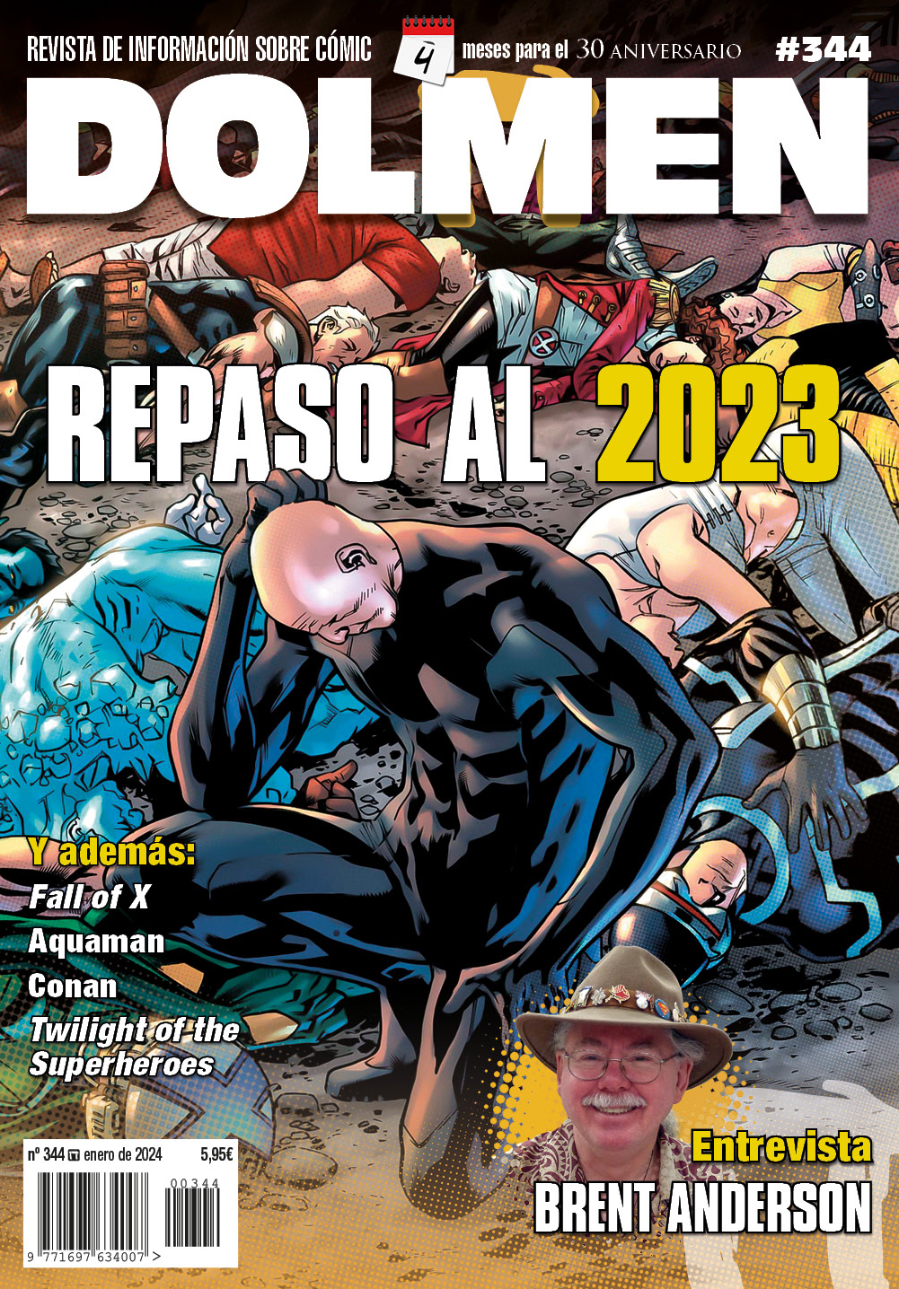 La publicación de esta revista que inaugura este nuevo año también marca el inicio de la cuenta atrás para la celebración del 30º aniversario de la revista Dolmen y su número 350. ¡Ya queda menos! Como manda la tradición, con cada nueva bienvenida a un nuevo calendario incluimos una retrospectiva del 2023, con un repaso pormenorizado a lo que ha supuesto el calendario pasado en la industria del cómic, con todos sus lanzamientos y polémicas más destacadas. Bajo esta portada tan representativa de lo que ha sucedido dentro y fuera de las viñetas Marvel, se incluye también un artículo detallando los últimos sucesos en la franquicia mutante con la tan comentada Caída de X.